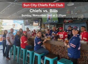 Join us at The Yard for the Sun City Chiefs Fan Club Watch Party! On Sunday, November 2nd at 2:25pm, experience the excitement of Chiefs vs. Bills surrounded by fellow fans—Chiefs and Bills alike. Enjoy our welcoming bar patio, delicious food, cold drinks, and unbeatable game day specials. Bring your friends, wear your team colors, and be part of the action. Everyone’s invited!