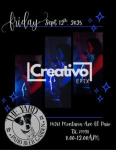 Join us on September 12th at 8pm for a live performance by Creativo EPTX. Bring your friends, enjoy some great drinks, and dance under the stars—plus, pups are always welcome on our patio! 💃🍻🐾