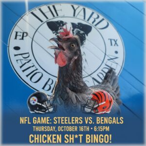 Join us Thursday, October 16th for an unforgettable night at The Yard! The action kicks off at 6pm with the Steelers taking on the Bengals, shown live on our big screen. We’re turning up the fun with our famous Chicken Sh*t Bingo—Let’s pluck it up!