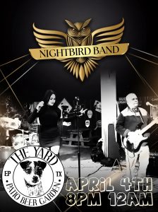 Looking for live music in El Paso this Saturday? Join us at The Yard Patio Beer Garden for a fun Saturday night with Nightbird Band performing live on Saturday, April 4 from 8 PM to 12 AM.